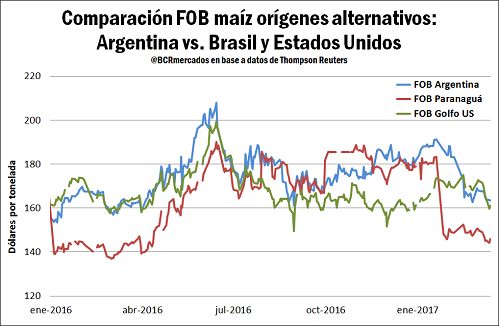 Buscando explicar lo anterior, debe tenerse en cuenta que por un lado los exportadores prefieren no correr riesgos con la mala experiencia del año pasado a cuestas, cuando comprometieron embarques que luego se les dificultó cumplir frente a una temporada en extremo lluviosa que demoró las entregas de grano a los puertos. Además, las ofertas locales no resultan del todo atractivas en la arena internacional: con un FOB argentino de U$S 163,5/t, tanto el origen brasileño a U$S 146,0/t como incluso el del Golfo estadounidense a U$S 161,1/t resultan más competitivos en el mercado global.