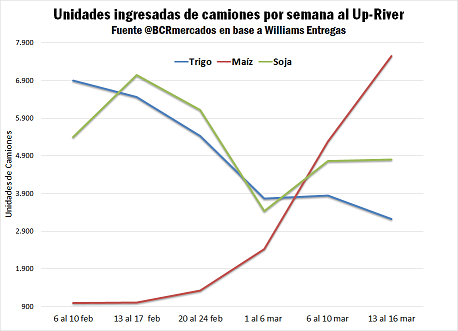 El estrellato del trigo fue perdiendo protagonismo luego del frenético adelanto de las compras por parte de la exportación en los meses veraniegos y la llegada del maíz nuevo al mercado. La evolución de los camiones ingresados a los puertos del Up River rosarino en las últimas semanas y que se muestra en el siguiente gráfico ilustra este comportamiento.