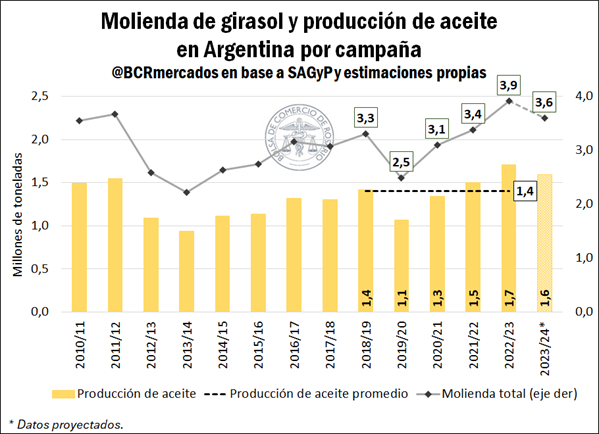 Las proyecciones para el año comercial 2023/24, comenzado formalmente el 1° de enero, indican una caída interanual en el nivel de producción de la oleaginosa, que se ubicaría en 3,9 Mt, dejando como resultado un descenso del 8% en los volúmenes de molienda proyectados. Así, un menor crushing, a pesar de un leve incremento en la ratio de extracción (44,2%), impactaría de manera directa en la producción de aceite de girasol, que podría registrar una caída interanual del 7% a 1,6 Mt. Pese a ello, tanto la molienda como la producción de aceite se ubicarían por encima del promedio de los últimos años.