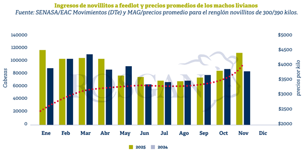 En paralelo, al analizar la estadística de ingresos de animales a corrales de engorde durante noviembre, se observa un incremento significativo respecto al mismo mes del año anterior, con un 35% más de novillitos ingresando a los feedlots, totalizando 112.703 cabezas.
