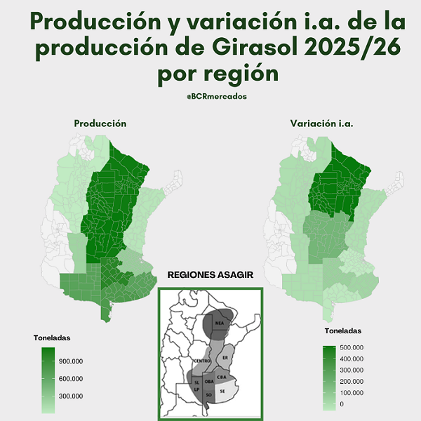 En base a la regionalización de girasol que realiza ASAGIR, las regiones donde mayor incremento de producción entre campañas se registra son el núcleo girasolero del NEA con 1.115.000 tn totales (+ 513.000 tn entre campañas) y la región Centro con 1.130.000 tn (+185.000 tn i.a.).
