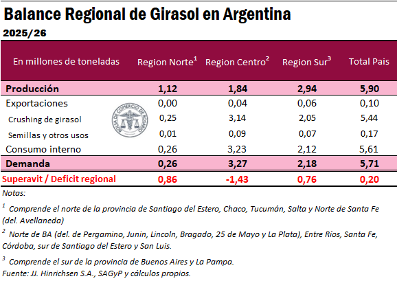 Oferta y uso regional de Girasol 2025/26 en Argentina