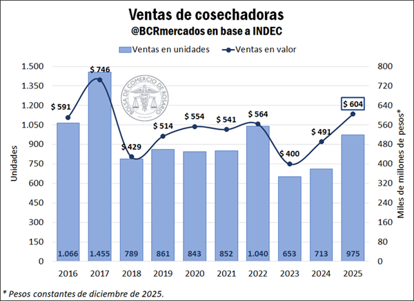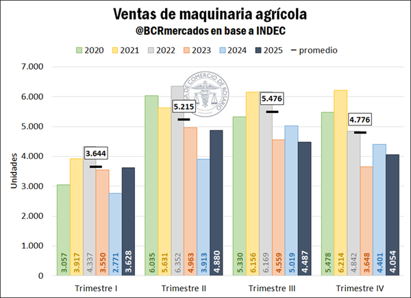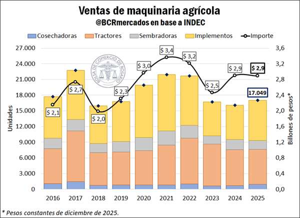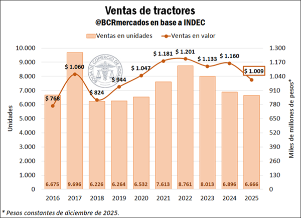 En el caso de los tractores, en 2025 se vendieron 6.666 unidades, 3% por detrás de la comercialización del año anterior y evidenciando un deterioro del 12% respecto al promedio de los últimos cinco años. En términos de valor, las ventas anuales alcanzaron un importe de $ 1 billón, registrando una caída real del 13% respecto a 2024, ante una contracción del 10% interanual en el precio unitario real de esta maquinaria.