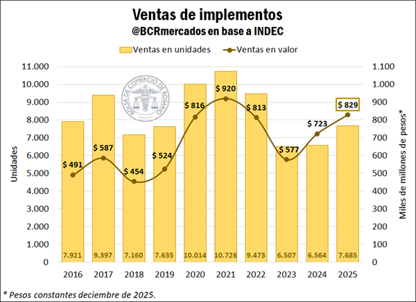 Por su parte, se advierte que en 2025 se vendieron 7.685 unidades de implementos, marcando una recuperación del 17% respecto al año previo. A pesar de ello, en comparación con el promedio, las ventas se ubicaron 11% por debajo. Del total de implementos comercializados, 803 unidades correspondieron a pulverizadoras autopropulsadas y de arrastre, 2.331 unidades a implementos de acarreo y almacenaje de granos, y 4.551 unidades a otros implementos. En términos de valor, la venta de estas máquinas alcanzó un importe de $ 828.700 millones, lo que marca un incremento real del 15% respecto a 2024, e incluso se posiciona 8% por encima del promedio.