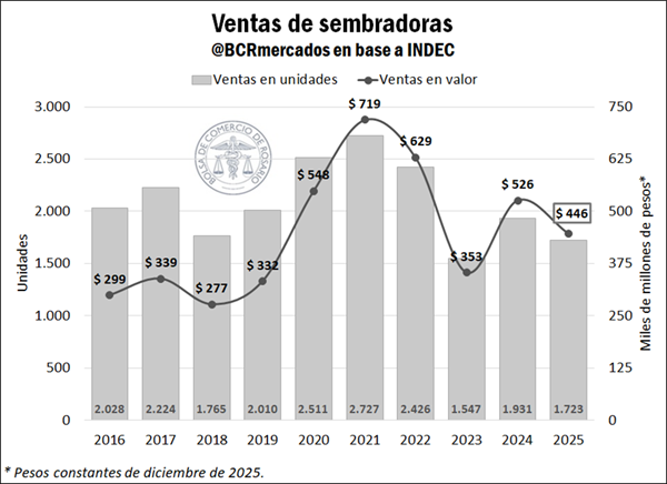 Finalmente, la cantidad vendida de sembradoras totalizó 1.723 unidades, marcando un retroceso interanual del 11% y posicionándose 23% por detrás del promedio del último quinquenio. Asimismo, se evidencia que los precios de estas maquinarias cayeron 5% en términos reales en el último año, de manera que el valor de las ventas, que totalizó $ 446.400 millones en 2025, registró una caída incluso más pronunciada: se posicionó 15% por debajo de 2024, y 20% por detrás del promedio.