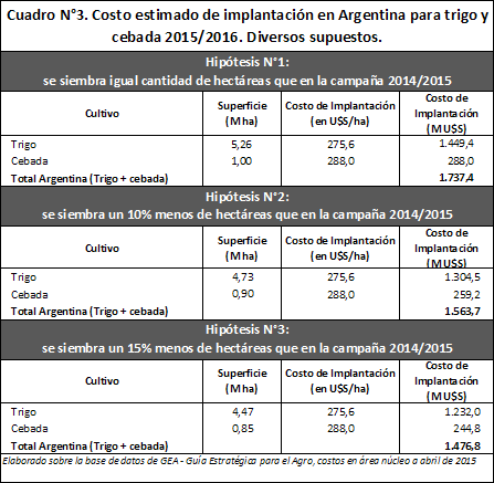 En la primera alternativa, el año pasado se sembraron según la Dirección Nacional de Información y Mercados del Ministerio de Agricultura, Ganadería y Pesca de la Nación cerca de 5.260.000 hectáreas con trigo y 1 millón de hectáreas con cebada. De repetirse este escenario en la nueva campaña 2015/2016, la inversión total por implantación de ambos cultivos ascendería 1.737 millones de dólares estadounidenses. El trigo demandaría 1.449 millones de U$S y la cebada aproximadamente 288 millones de U$S.Numerosos especialistas y asesores técnicos ven difícil que se vuelva a sembrar con trigo y cebada la misma cantidad de hectáreas que el año anterior. El propósito de sembrar cultivos de fina quedaría relegado a campos propios con el fin de controlar malezas y respetar la rotación. En consecuencia, hemos procedido a plantear dos escenarios. El primero de ellos con una caída del 10% en el área nacional implantada respecto de los valores registrados en el 2014/2015. Y la segunda (denominada Alternativa N°3), con una caída mayor del orden del 15% respecto del área implantada el año pasado.