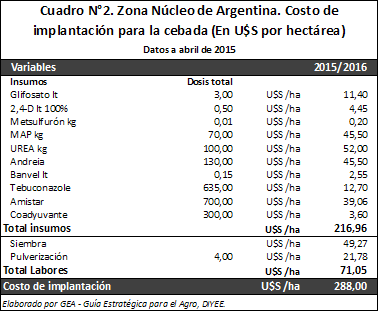 Como puede observarse en el cuadro N°1, el costo de implantación para el trigo rondaría en los 275 U$S por hectárea. En el cuadro N°2 se detallan los de la cebada: 288 U$S la hectárea. Luego en el cuadro N°3 evaluamos la inversión en U$S estadounidenses que deberían efectuar la totalidad de los productores agropecuarios bajo diferentes escenarios de superficie implantada a nivel nacional:Alternativa N°1: se siembra igual cantidad de hectáreas de trigo y cebada que en la campaña pasada (2014/2015).