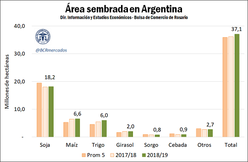 De cumplirse estas proyecciones, el área total sembrada en Argentina la campaña 2018/19 alcanzaría un récord histórico de 37,2 millones de hectáreas, en línea con las intenciones del año anterior aunque un millón de hectáreas por encima de lo que efectivamente pudo ser implantado entonces.
