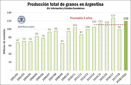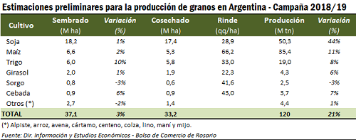 Asumiendo que el rinde se asemeja a su valor tendencial para cada cultivo, las siembras permitirían obtener en la campaña 2018/2019 una producción total de granos de 120 millones de toneladas, muy por encima de los 99 millones de la campaña previa y el segundo mayor registro de la historia.