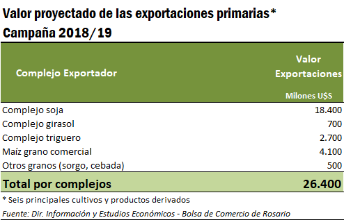 Se estima a su vez que estos seis cultivos podrían generar un ingreso de divisas al país por exportaciones que podría ubicarse en los US$ 26.400 millones. El principal aporte a la balanza comercial provendría del complejo sojero, responsable de más de 40 millones de toneladas de exportaciones entre poroto y subproductos, por un total de US$ 18.400 dólares (el 70% del total). El maíz, por su parte, despacharía unos 22,5 Mt por un total de US$ 4.100 millones, o un 16% del ingreso de divisas del sector primario, en tanto que el complejo triguero embarcaría unos 13 Mt por un monto total en torno a los US$ 2.700 millones (un 10% del total). El complejo girasol daría cuenta de otro 3% del valor de las exportaciones de granos y derivados, mientras que el restante 2% lo aportarán cebada y sorgo.