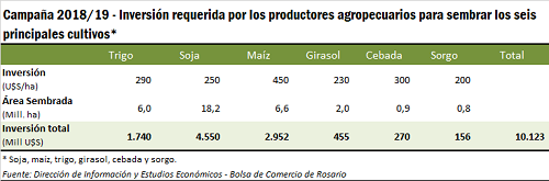 Se estima que la implantación proyectada de soja, maíz, trigo, girasol, cebada y sorgo para la campaña 2018/19 por un total de 34,4 M ha demandará una inversión total del sector productor superior a los US$ 10.000 millones, de los cuales más del 90% corresponden a soja, maíz y trigo. El maíz, particularmente, es el cultivo que mayores erogaciones demandan por hectárea sembrada con US$ 450/ha, aunque por la mayor superficie a implantar la soja se lleva la mayor parte de la inversión a pesar de su menor costo relativo por hectárea (US$ 250/ha). Así, mientras que la producción del cereal requerirá un gasto de siembra total de US$ 3.000 millones, la oleaginosa requerirá invertir US$ 4.550 millones. Trigo y cebada, por su parte, tienen un costo de siembra por hectárea muy similar en torno a los US$ 290 y 300 /ha, respectivamente, demandando una inversión total de US$ 1.740 y 270 millones; mientras que la implantación de girasol requerirá aplicar fondos por US$ 455 millones y el sorgo, con un paquete tecnológico más modesto, US$ 156 millones.