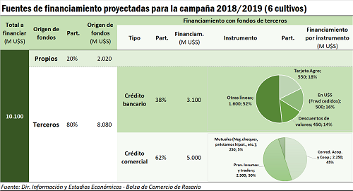Con una proyección de 37 millones de hectáreas para sembrar en el 2018/19, la inversión del productor para cubrir la implantación de esa superficie rondaría los U$S 10.100 millones. ¿A través de quién o de qué instrumentos se financiaría el productor?; ésa es la pregunta por responder y que se analiza en este texto. Con condiciones climáticas normales, rendimientos de tendencia y sin inconvenientes, se podría estar ante un valor bruto de producción equivalente a 25.500 millones de dólares a los precios a cosecha vigentes en el presente y un ingreso por exportaciones cercano a 26.400 millones de dólares.