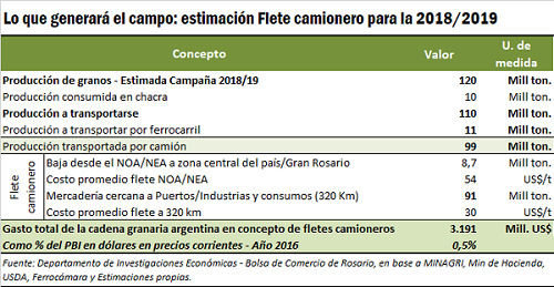 El traslado de las 120 millones de toneladas de granos que se esperan para la campaña 2018/2019 podría generar fletes camioneros por un cifra que podría ubicarse en los 3.200 millones de dólares. Sería un ingreso fundamental para generar una recuperación de un sector como el camionero que se verá seriamente afectado por los resultados de la campaña 2017/2018 al haberles faltado cerca de 25 millones de toneladas para transportar desde chacra a los Puertos, Fábricas e Industrias, especialmente ubicados en la zona central del país.
