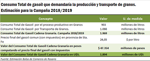De acuerdo a nuestras estimaciones, el consumo de gasoil que podría efectivizarse en esta campaña de casi 120 Mt de granos se situaría en una cifra cercana a los 2.000 millones de litros. Esto implicaría un gasto cercano a los 1.900 millones de U$S. Nuestras estimaciones se refieren solamente a la producción y transporte de los siguientes granos: soja, maíz, girasol, sorgo, arroz, maní, trigo, avena, centeno, cebada cervecera, alpiste, cártamo, colza, lino, cebada forrajera y trigo candeal.