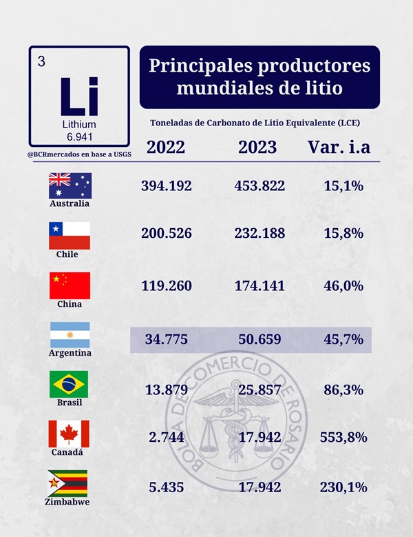 En este sentido, al inicio del 2023 sólo dos proyectos del complejo litio se encontraban en producción. En un marco de progresivas puestas en marcha, al cierre de este año se espera que 7 proyectos de litio se encuentren produciendo y exportando en Argentina. El año pasado la producción de litio ya creció más de un 45% en nuestro país, de acuerdo con el Servicio Geológico de los Estados Unidos (USGS). Así, Argentina se ubicó como cuarto productor y tercer exportador global de este insumo clave para la transición energética.