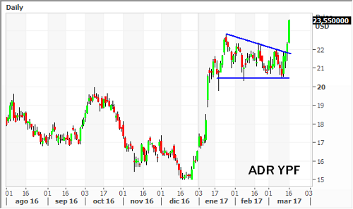 Entre los títulos de mejor performance en las últimas jornadas destaca YPF, la cual acumula ganancias superiores al 13% para la semana en el mercado local. Como podemos ver en el gráfico de su ADR, los valores reconocieron el soporte ubicado en la zona de u$s 20,50 incluso a pesar de la fuerte caída del crudo de la semana pasada, tras la cual logró quebrar la tendencia bajista registrada por su recientes máximos. Las acciones de la petrolera local representaron alrededor de un 13% del volumen efectivo operado en acciones para la semana finalizada el jueves 16 de marzo, jornada en la cual aproximadamente un 22% del total negociado correspondió a dicho título.