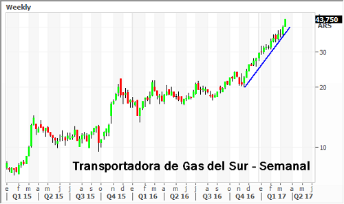 En segundo lugar se coloca Transportadora de Gas del Sur (+x% para la semana), que continúa con su alza meteórica habiendo ganado casi 150% en lo que va del año. La siguiente gráfica con su evolución semanal sobre una escala logarítmica permite apreciar como su tasa de crecimiento se ha mantenido relativamente constante a lo largo del movimiento alcista.