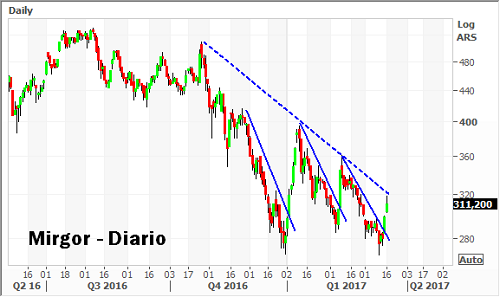 Finalmente, cerramos el trío de acciones con mayor suba para la semana con Mirgor, con un avance del 8,8%. Los títulos de la empresa mantienen una clara tendencia bajista de mediano plazo desde principios del segundo semestre del año pasado, pero recientemente han alternado bruscas bajas con abruptas recuperaciones que no obstante no le permiten superar sus recientes máximos.