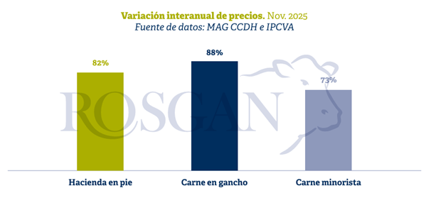 A la fecha del relevamiento de precios —mediados de noviembre— la brecha respecto de la hacienda en pie, e incluso frente a la carne mayorista, mostraba un rezago de entre 10 y 15 puntos porcentuales. En tanto, durante el último mes —tomando como referencia los valores promedio registrados la semana pasada— el precio del novillito liviano en el MAG avanzó otro 10%, al pasar de $4.000 a $4.400 por kilo vivo, mientras que la referencia para esta misma categoría en gancho registró un incremento del 7,5%, según datos del CCDH (Centro de Consignatarios Directos de Hacienda), al subir de $7.000 a un promedio de $7.525 por kilo.