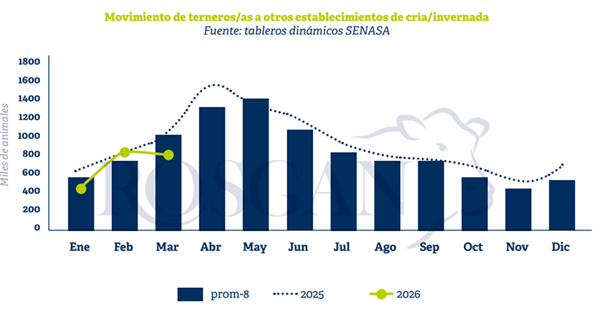 Según datos oficiales de SENASA, durante marzo se trasladaron 795.871 terneros y terneras desde establecimientos de cría hacia otros destinos productivos (cría/invernada), lo que implica una contracción del 3% respecto de febrero y una caída interanual del 21% en relación con igual mes de 2025.