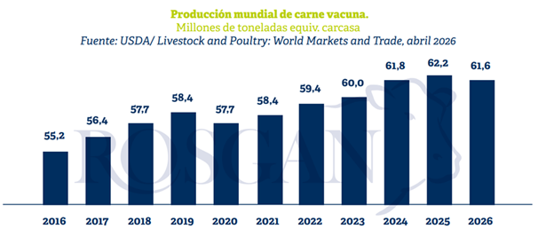 A nivel global, se espera que en 2026 la producción de carne vacuna disminuya un 1%, hasta alcanzar 61,6 millones de toneladas, lo que implica un recorte de 685.000 toneladas respecto de 2025, frente a las 913.000 toneladas proyectadas seis meses atrás. Se trata de la primera caída en producción, tras cinco años de crecimiento ininterrumpido.