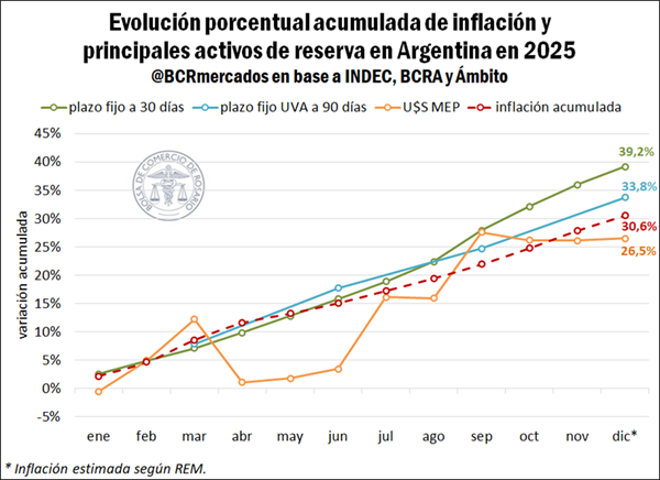 Por su parte, en materia de colocación de ahorros, los plazos fijos en pesos lograron ganarle a la inflación. En lo que refiere a los plazos fijos a 30 días, se estima que los mismos rindieron un 39,2% acumulado a lo largo de 2025, ampliamente por encima de la inflación, mientras que los plazos fijo UVA a 90 días registraron un retorno total estimado del 33,8%.