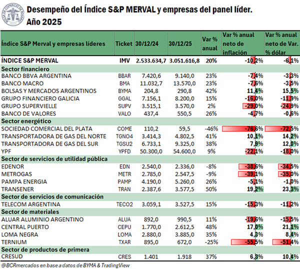 Por otro lado, si se considera las variaciones anuales ajustadas por inflación o el dólar MEP, se puede observar que fue un año “selectivo” en materia de empresas que registraron un resultado positivo en 2025. Esto, teniendo en cuenta que se viene de varios años de importantes subas en la bolsa argentina, lo cual dejó el escenario planteado para leves correcciones a nivel general y de variada índole a nivel de empresas.