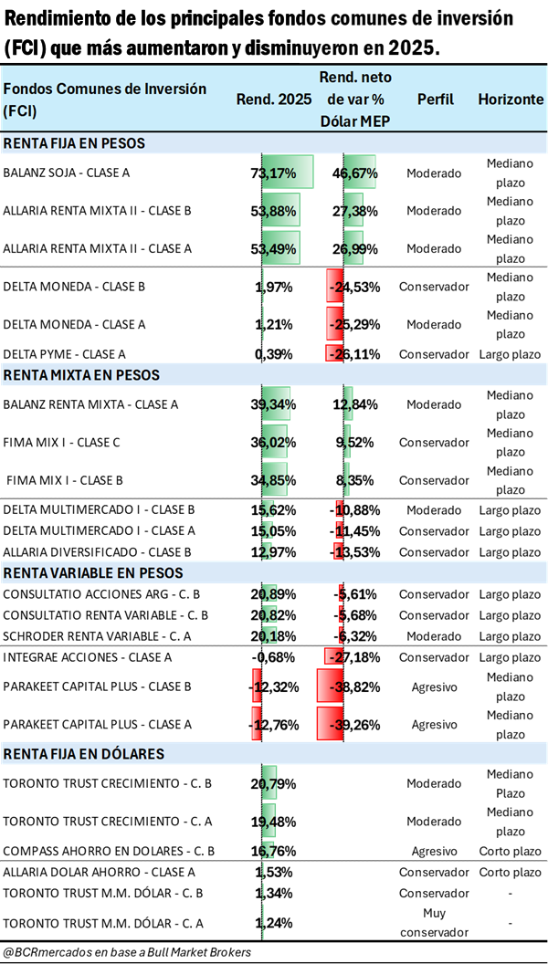 En el caso de los FCI, existen diferentes tipos de instrumentos considerando la composición por renta fija, mixta y variable. En el siguiente cuadro se muestran los fondos con mejores y peores resultados según la composición de activos.