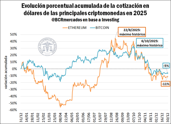 Finalmente, en lo que refiere a la inversión en criptoactivos, se advierte que los mismos mostraron un desempeño con importantes altibajos a lo largo del año 2025. Por un lado, el Bitcoin, la criptomoneda de mayor capitalización de mercado del mundo, registró una caída punta a punta del 5%, aunque esta tendencia no fue regular a lo largo de los meses. De hecho, el Bitcoin alcanzó un máximo histórico a principios de octubre, de manera que entre principios de abril (menor valor en el año) y aquella fecha la variación acumulada fue del 63%. Este incremento resultó de una convergencia de factores, entre los que se incluyen entradas de transferencias electrónicas de fondos institucionales, una reducción de la oferta y condiciones macroeconómicas internacionales, como bajas en las tasas de interés, que hicieron más atractivos a los activos de riesgo, como las criptomonedas.