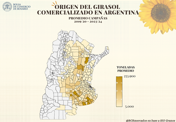 Se estima que, en promedio, se comercializaron 3,4 Mt de girasol por ciclo comercial durante las últimas cinco campañas, en línea con una producción promedio de 3,7 Mt. Más del 85% de la mercadería comercializada en el país se origina en tres provincias: Buenos Aires (60%), Santa Fe (15%) y La Pampa (11%). Dentro de estas tres provincias, la originación no resulta uniforme en todo el territorio, sino que, lógicamente, se encuentra ligada a las zonas de mayor producción del cultivo. En Buenos Aires, sobresalen los partidos del sur, como Tandil, Necochea y Tres Arroyos, y del oeste, como Trenque Lauquen y Daireaux; en Santa Fe, predominan los departamentos del norte, principalmente General Obligado, San Justo y San Cristóbal; mientras que, en La Pampa, toman relevancia los partidos del noreste, como Catriló, Maracó y Conhelo.