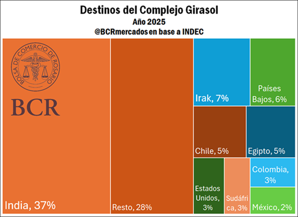 En términos de destinos, Argentina exporta con su Complejo Girasol a los cinco continentes del mundo, con 89 países entre sus destinos de exportación sólo en 2025. Sin embargo, el destino de mayor relevancia es la India. Con exportaciones por US$ 848 millones de dólares, el gigante asiático representa más del 37% del total exportado por el Complejo Girasol, exportándose fundamentalmente aceite de girasol en bruto. Esto es muy relevante, en tanto en 2025 Argentina se convirtió en el principal abastecedor de aceites vegetales de la India.