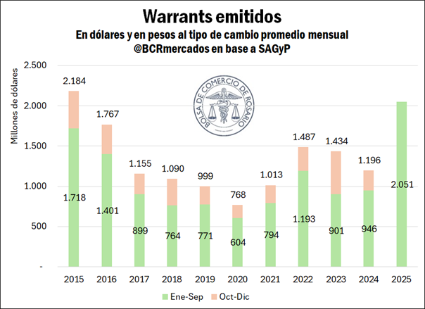 Este marco de modificaciones fue un factor que colaboró en darle un nuevo impulso al financiamiento con warrants en el país en 2025. Sumando las emisiones de warrants en dólares y en pesos (convertidas estas últimas al tipo de cambio comprador promedio mensual en cada dato mensual de emisiones), los primeros nueve meses del año dejaron un financiamiento en warrants superior a los US$ 2.050 millones. Esto representó un crecimiento interanual del 116%, duplicándose con creces. Cerca del 93% del financiamiento otorgado en warrants fue emitido en dólares en este 2025. El 2025 podría finalizar con un récord de financiamiento de warrants en más una década.