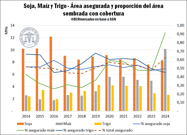 - A partir de 2020 se observa un cambio en la estructura de la cobertura para los cultivos. Los cereales desplazaron a las oleaginosas como principal grupo asegurado.