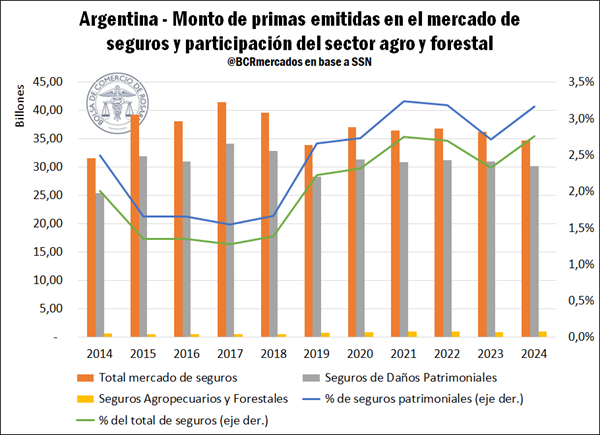 - A pesar de la creciente participación en los últimos años, los seguros agropecuarios y forestales aún representan una porción reducida del mercado asegurador. Esta baja participación refleja desafíos estructurales del sector —mayor exposición climática, creciente variabilidad productiva y necesidad de instrumentos más modernos— y pone de manifiesto el amplio margen existente para avanzar hacia esquemas de gestión de riesgos más complejos, diversificados y acordes a las condiciones del agro.