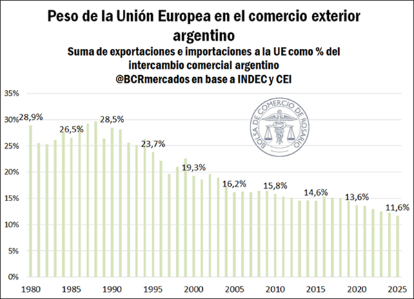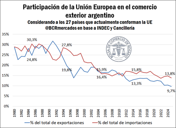 Si tomamos en conjunto el intercambio comercial, sumando exportaciones e importaciones a la UE como porcentaje de total, nos encontraremos con un escenario similar. De esta manera, en 2025 el intercambio comercial con la Unión Europea fue el más bajo en al menos 45 años en su participación sobre el total, continuando una tendencia de décadas que puede comenzar a revertirse progresivamente de la mano de este acuerdo.