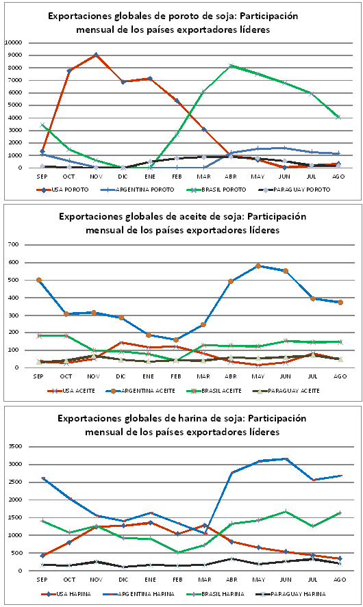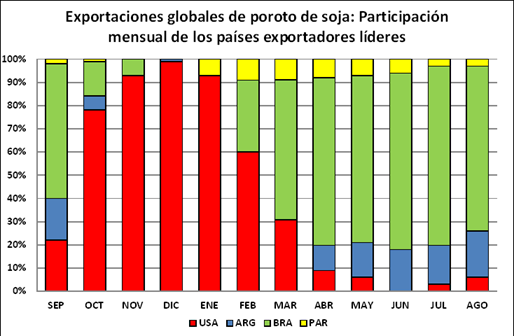 En el primer mes del inicio de la campaña comercial, en setiembre de 2013, el principal proveedor de poroto de soja fue Brasil con casi el 58% de las ventas totales. Estados Unidos vendió el 22% del total y Argentina el 18%. A partir del mes de Octubre y ante la aparición de la cosecha norteamericana, es Estados Unidos el país que monopoliza la provisión de poroto de soja en el mundo. En ese mes provee el 78% del total vendido al exterior, seguido por Brasil con el 15%. Desde noviembre 2013 a Enero de 2014 inclusive, el gran proveedor es Estados Unidos con más del 90% del total en cada mes. En Febrero, con la entrada de la cosecha brasileña y paraguaya, Brasil recupera presencia en las exportaciones de poroto entregando el 30% de las ventas externas de ese mes. Estados Unidos en Febrero 2014 remitió el 60% y Paraguay un 8,8% del total.