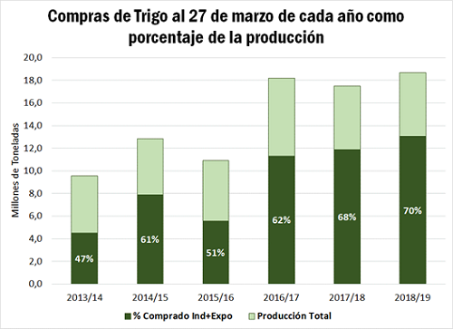 De estas 13,1 Mt adquiridas al 27 de marzo, según datos oficiales, 10,7 corresponden al sector exportador, mientras que las 2,4 Mt restantes fueron compradas por la industria molinera. Por otra parte, el 84% de las compras totales fue hecho con precios en firme, mientras que el 16% restante de los negocios se realizaron bajo la modalidad 'a fijar'.