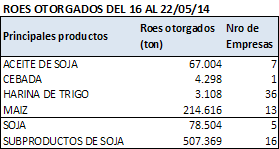 Sin embargo, la mayor fluidez comercial de los últimos días no oculta la importante acumulación de oferta que se mantiene al margen del circuito comercial o no ha sido originada aún por los exportadores o la industria. Estos participantes han declarado compras hasta el 14 de mayo por 6,4 y 10,1 millones de toneladas, respectivamente. Dicha suma representa solamente el 30% del tamaño de la cosecha, proporción que habitualmente se encuentra negociada ya a finales de marzo. Si ese retraso de un mes y medio se extiende hasta fin de ciclo el stock de cierre se ampliaría sustancialmente respecto del registrado en la última campaña, estimado en 4,2 millones de toneladas.