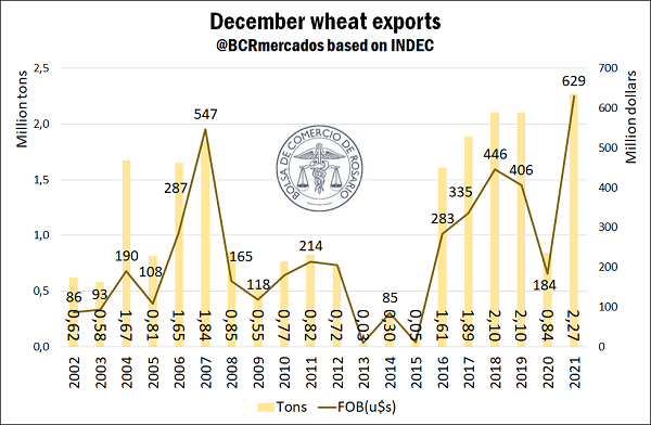 The record of wheat exports is not just for tons exported. Last month, it was also the best December for export value, which exceeded US$ 629 million. A strong rebound in FOB (Free on Board) export values helped this record contribution of foreign currency. The ton of wheat was exported with an FOB value of US$ 277/t, more than 26% above the US$ 219/t that were paid in December 2020. However, it should be noted that wheat export prices were far from being the highest on record. Higher values were recorded for this month in 2007, 2012, 2013 and 2014. The maximum value observed was in December 2013, with an export price of almost US$ 345/t.