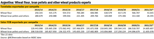 However, the largest export drop was recorded at the beginning of the crop season (December 20/January 21), when the lower harvest and the interruption of port activity limited exports. In contrast, the end of the crop season (November 21) showed a rebound in flour exports, which grew by 15% compared to October and 10% year-on-year. Thanks to the better prices of the last crop, the total FOB value exported in flour 2020/21 (US$ 186 M) fell by 7%, in a smaller proportion than the fall in volume.
