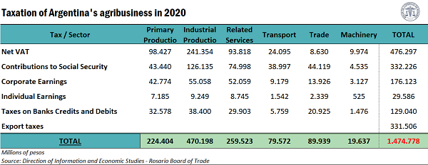 In 2020, farming and the agrifood and agribusiness chains in our country/1 generated a tax income for the National State of $ 1,474,788 million, according to our own estimates. This equals to US$ 20,940 million, taking the average official exchange rate for said year. Considering that the annual collection reported by the Federal Administration of Public Revenues totalled $ 7.2 trillion in 2020, farming and the agribusiness chains represented 20.4% of the total, that is, 1 out of every 5 pesos entered into the coffers of the National State.