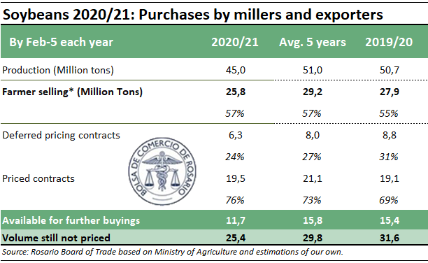 To that, it must be added the 10% year-on-year production cut, according to estimations by the Rosario Board of Trade Agribusiness Strategy Guide (GEA, for its Spanish acronym), which leaves a balance of available soybean for sale from crop season 2020/21 of 11.7 million tons, far behind the availability of the last few years, which was around 15.5 million tons.