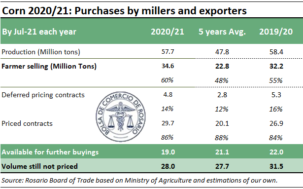 In a context of better prices and solid levels of demand, wheat trade for the next crop season progresses at record levels, exceeding 4 Mt. It is surprising, however, the high share of unpriced firm trades, which exceeds by 10 percentage points the average of the last few crop seasons. The evolution of markets during the upcoming months will be key for price setting. During July, wheat showed increases of around 5% of its dollar price for the domestic market, going from around US$ 200/t to near US$ 210/t.