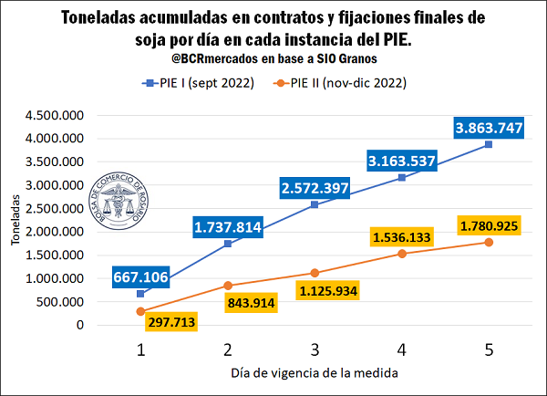 Al comparar el volumen acumulado durante los días hábiles de vigencia de cada fase del Programa de Incremento Exportador, encontramos que el volumen de comercialización actual es menos dinámico con relación a la primera edición del programa. En este sentido, en los primeros cinco días hábiles del PIE I se operaron 3,8 Mt, el doble de lo que se lleva operado en el PIE II para igual período de tiempo. No obstante, es importante recalcar que en septiembre se registraba una desaceleración importante en la comercialización de la soja respecto al promedio histórico, mientras que actualmente se retornó a los niveles promedio y queda menos soja por comercializar por parte de los productores.