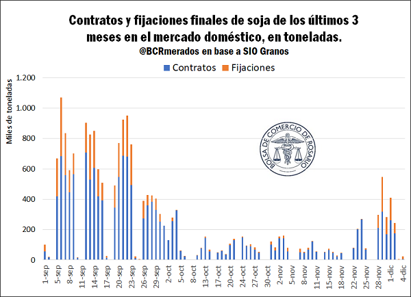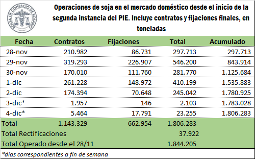 Frente a ello, se observa en el mercado interno una aceleración de las ventas de soja, que se habían ralentizado luego de la primera instancia del PIE. De acuerdo con lo registrado en SIO Granos entre el 28 y el 4 de diciembre, se hicieron negocios nuevos por un total de 1.143.329 toneladas, fijaciones por 662.954 toneladas y rectificaciones con un total de 37.922 toneladas. Se excluye del cómputo del volumen de operaciones las anulaciones y las anulaciones de fijación, y se consideran sólo las transacciones “finales”.