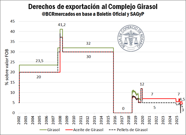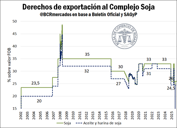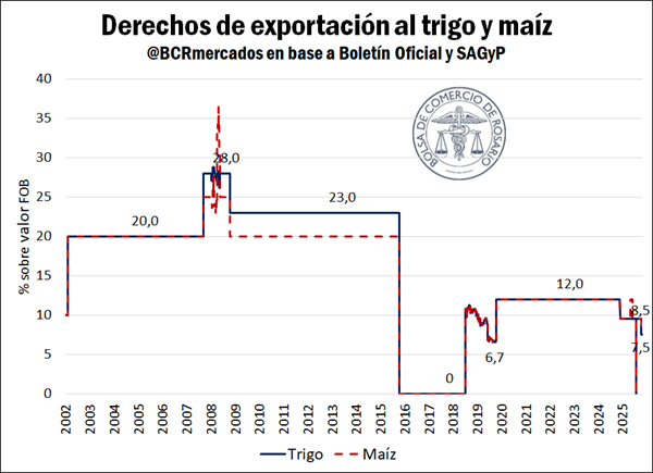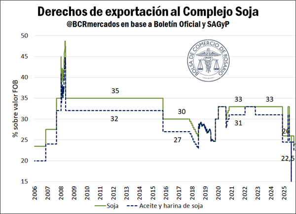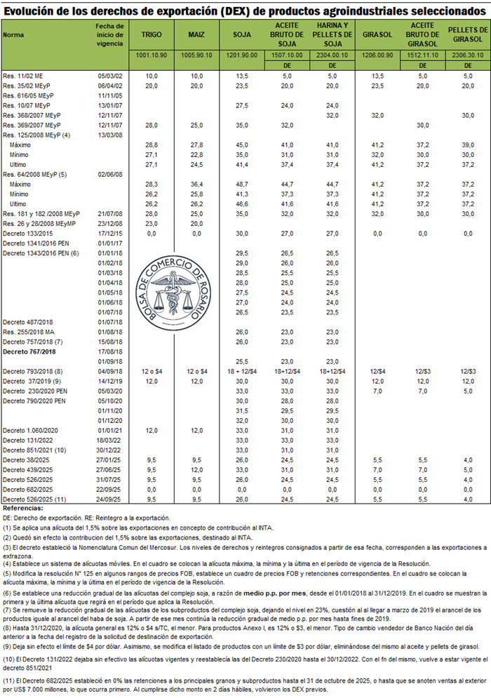 Cuadro actualizado con la evolución de las alícuotas aplicables a la exportación de productos agroindustriales seleccionados, entre los que se encuentran los principales granos y subproductos que produce y embarca Argentina.