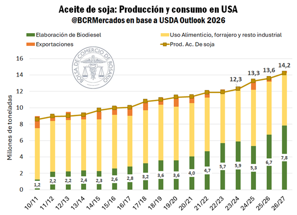La primera proyección para la producción norteamericana de soja de la campaña 2026/27 es de 121 Mt, 4,4% más que la campaña actual y 1 Mt por encima de las expectativas del mercado en la previa. Según el Outlook del USDA se sembrarían 34,4 Mha con soja en Estados Unidos, un 5% más que el ciclo pasado impulsado por márgenes operativos relativamente más atractivos respecto a otros cultivos.