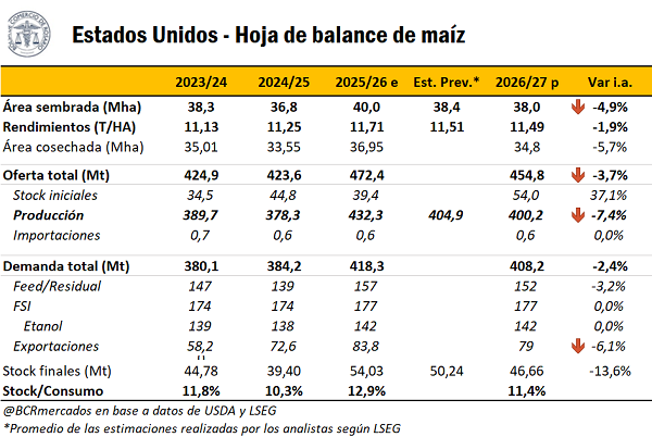 Las primeras proyecciones preliminares para el maíz 2026/27 en Estados Unidos son de caída en la producción, menor oferta total y menores exportaciones. Luego de un año extraordinario, tanto en superficie sembrada como rindes, la 2026/27 se proyecta con 38 Mha sembradas de maíz, 2 Mha hectáreas menos que la última campaña y apenas por debajo de las expectativas del mercado; con rindes medios que caerían un 2%, dejando niveles productivos de 400 Mt de maíz.