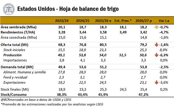 Los guarismos proyectados para la campaña que llega son dispares. Se augura una caída en la producción de 3,4 Mt (-6,3%) respecto a la 2025/26. La oferta total, si bien se ajusta hacia abajo, se ve amortiguada por stocks iniciales que crecieron sustancialmente 2,1 Mt (+8,9%) hasta 25,3 Mt, con la salvedad de que el USDA asumió condiciones climáticas normales para el desarrollo de los cultivos y las cifras se ajustarán con mayor robustez en mayo, al incorporarse las encuestas de intención de siembra de los agricultores. Por último, las exportaciones encuentran desafíos evaluando una competencia internacional más agresiva desde Argentina y Australia tanto como el hemisferio norte, proyectándose 1,4 Mt inferiores (-5,6%) y se posicionan en 23,1 Mt para el nuevo ciclo. Los stocks finales quedan prácticamente sin cambio, ya que superan a la temporada anterior por 0,1 Mt y quedan en 25,4 Mt