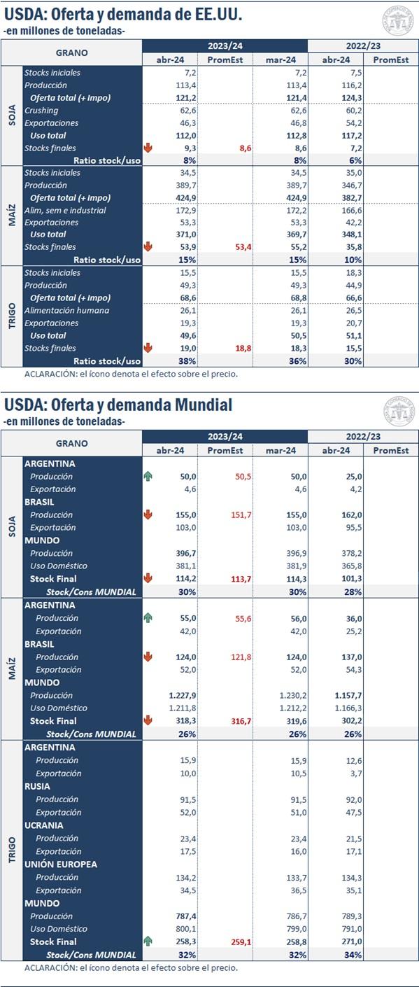 Previo al informe, los contratos por soja en Chicago operaban en más de USD 2 a la baja con la mirada puesta sobre los stocks finales globales y el nivel de producción sudamericano. El WASDE de abril trae recortes sobre los stocks mundiales y mantiene el nivel de producción argentino y brasilero. Frente a la media de las expectativas, si bien las reducciones en oferta no son tan holgadas como el mercado esperaba, por ahora se ha revertido la tendencia en Chicago y cubre las pérdidas anteriores al informe.